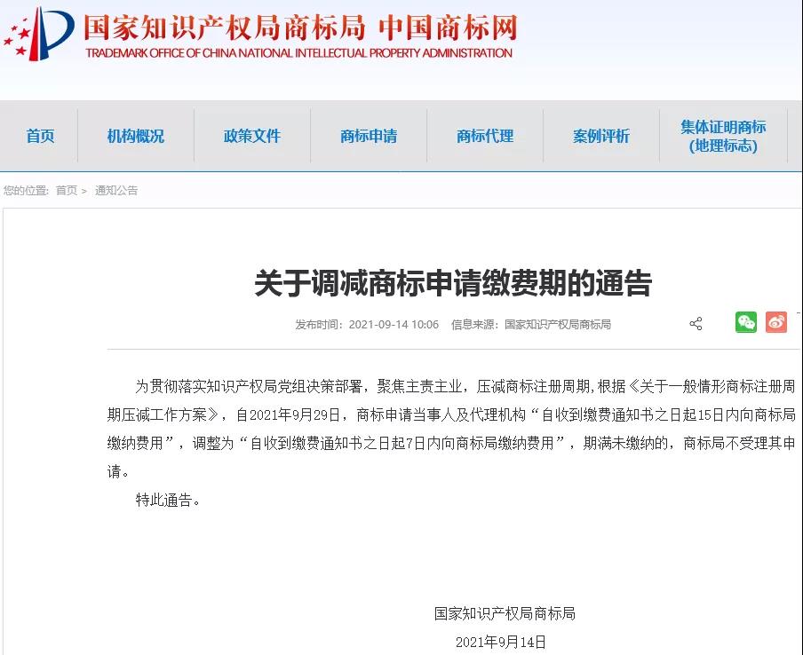 近日,,,,中国商标网发布关于调减商标申请缴费期的通告。。。通告指出,,自2021年9月29日,,,,商标申请当事人及代理机构“自收到缴费通知书之日起15日内向商标局缴纳费用”,,调整为“自收到缴费通知书之日起7日内向商标局缴纳费用”,,,,期满未缴纳的,,,商标局不受理其申请。。。