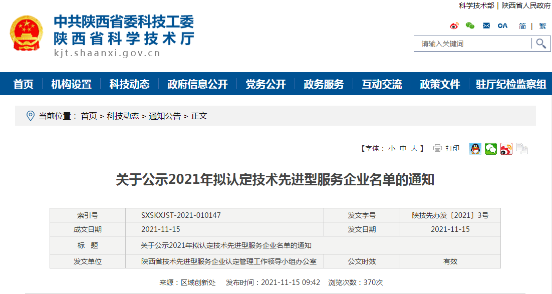根据《陕西省技术先进型服务企业认定管理办法(试行)》(陕科产发﹝2017﹞220号)、、、《关于在〈陕西省技术先进型服务企业认定管理办法(试行)〉中增补〈技术先进型服务业务领域范围(服务贸易类)〉的通知》(陕科办发﹝2018﹞118号)精神,,,,经企业申报、、地市审查推荐,,,省科技厅会同省财政厅、、、省税务局、、、省商务厅、、、、省发展改革委组织专家评审,,现对拟认定技术先进型服务企业名单(详见附件)进行公示,,,公示期为10个工作日。。。。