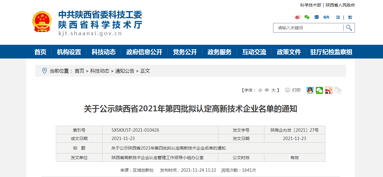 关于公示陕西省2021年第四批拟认定高新技术企业名单的通知